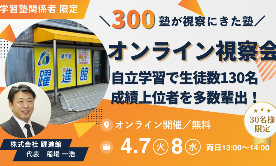 300塾が視察に訪れた「躍進館(埼玉県草加市)」の授業風景を、まるで視察しているかのようにオンラインでご覧いただける特別視察会で...