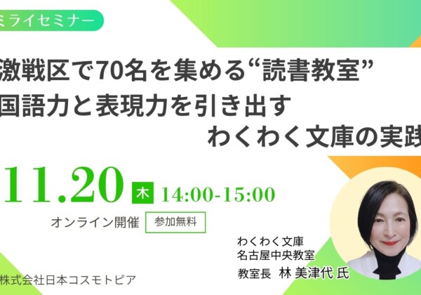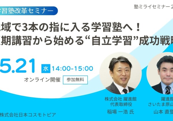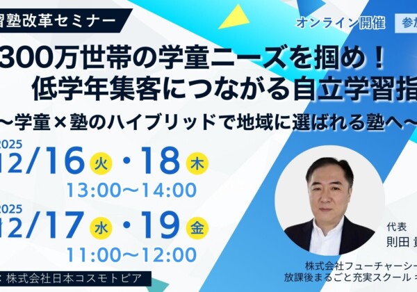 学習塾を対象とした塾ミライセミナーを 2025年11月20日(木)14:00〜15:00 にてオンライン開催します。 近年、全国...
