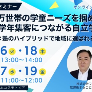 | タイトル | 株式会社日本コスモトピア 学習塾改革セミナー 先生1人×生徒40人「自立型学習」が起こす、新しい教室運営のカタチ ~「うちの子が5教科200点台から456点に!」“教える”から“引き出す”へ~ |