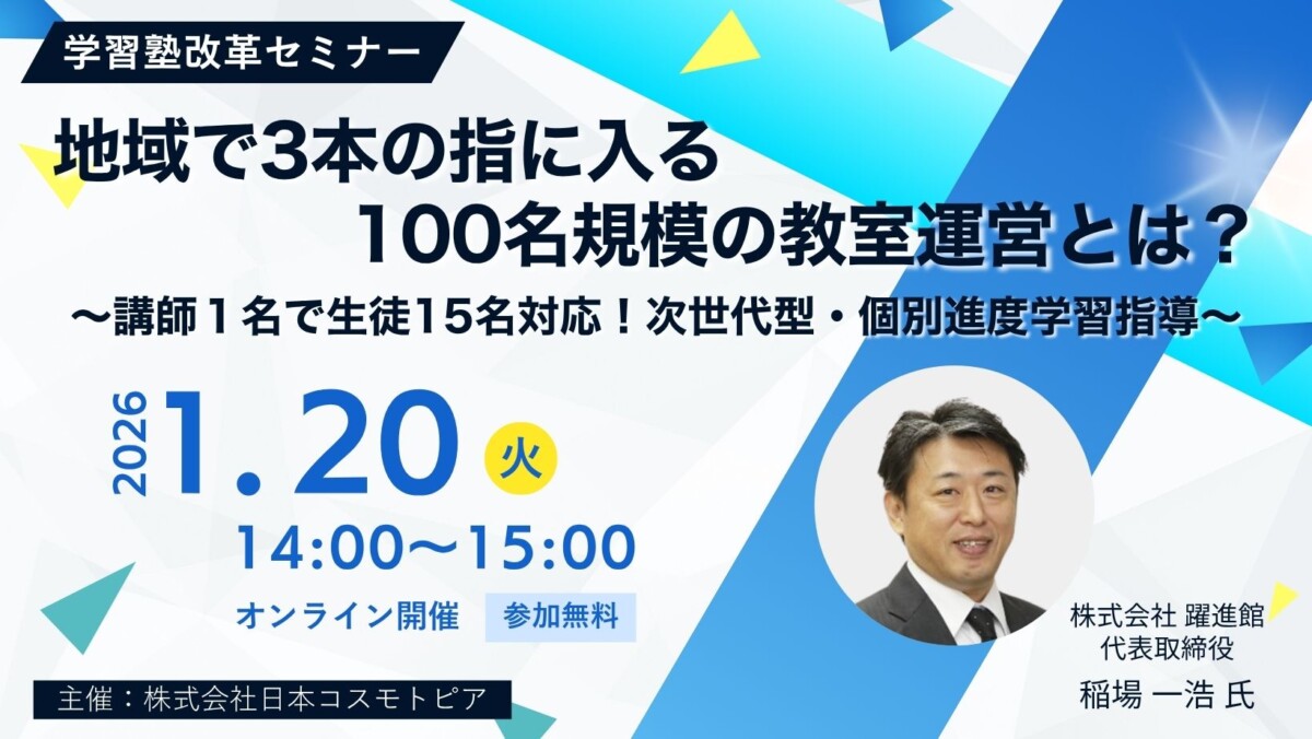 学習塾を対象とした塾ミライセミナー2025・学習塾改革セミナー。学習塾業界の課題にいち早く取り組んできた株式会社躍進館 稲場一浩氏をゲストにお招きし、2026年1月20日(火)14:00〜15:00にてオンライン開催します。