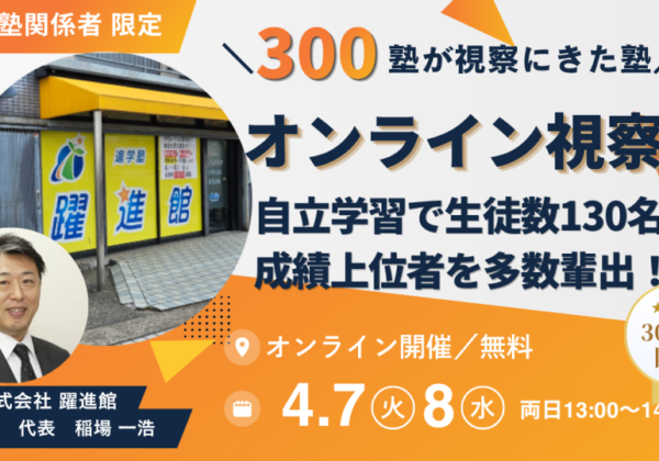 300塾が視察に訪れた「躍進館(埼玉県草加市)」の授業風景を、まるで視察しているかのようにオンラインでご覧いただける特別視察会で...